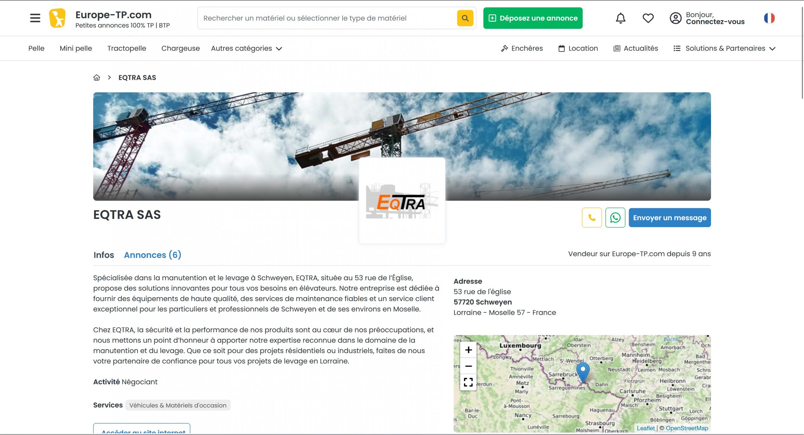 Nous sommes basés à Schweyen, près de Bitche en Moselle,à un jet de pierre de l’Allemagne, à mi-distance entre Strasbourg (Alsace) et Metz (Lorraine). Nous proposons des prestations d’achat-vente, de location de grues et de matériel de chantier en France et à l'international : Europe (Allemagne, Luxembourg, Belgique, Pays-Bas, Portugal et Italie) et Afrique principalement.